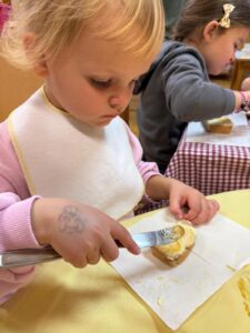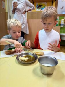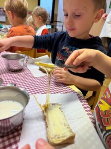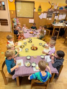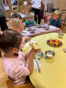 Tudi letos smo v našem vrtcu na Volarjih obeležili tradicionalni slovenski zajtrk. Sovice in Žabice smo pripravile svečani pogrinjek in mizo obložili s tradicionalnimi živili. Poudarili smo pomen uživanja zdravega zajtrka in lokalno pridelane hrane. V prijetni družbi nam je sladek zajtrk še bolj teknil.