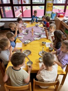 V našem vrtcu smo Tradicionalni slovenski zajtrk preživeli v prijetnem, domačem vzdušju. Ob svečano pripravljenih mizah smo poseben poudarek namenili pomenu lokalne hrane, saj smo se osredotočili tudi na letošnji slogan projekta ˝Moja izbira je slovenska hrana˝, zato smo zajtrkovali lokalno pridelano mleko, med, maslo in jabolka skupaj z domačim kruhom. Pogovarjali smo se o pomenu zdrave prehrane in o tem, kako pomembne so čebele za naše okolje. Ob sproščeni glasbi in prijetnem druženju smo preživeli lep, povezovalen jutranji čas, ki je otrokom ponudil tako novo znanje kot tudi toplo izkušnjo skupnosti.