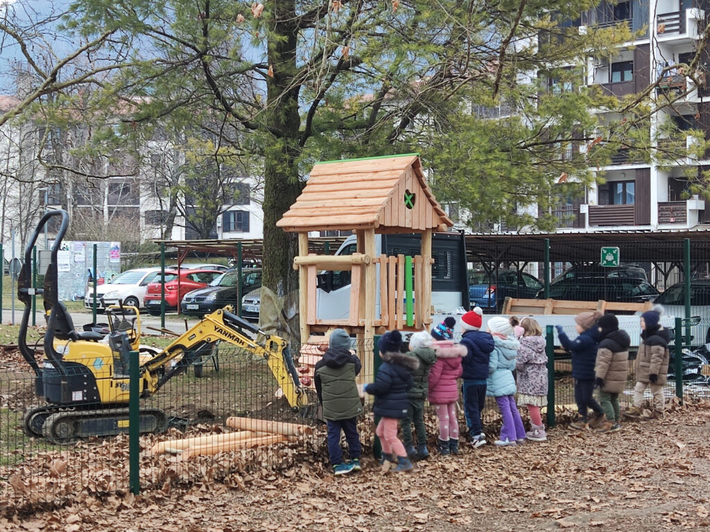 V petek, 23. januarja, je bilo kljub pustemu vremenu na našem igrišču zelo zanimivo. Delavci so s kamionom pripeljali majhen bager, ki je takoj vzbudil zanimanje vseh otrok. Le kaj se pripravlja na drugi strani ograje? Presenečenje je bilo popolno, ko je pred radovednimi otroškimi očmi zrasla hiška s toboganom. Na igrišču za mlajše otroke smo dobili novo igralo. Škoda le, da vreme ni najbolj naklonjeno bivanju na prostem, da bi ga lahko dobro preizkusili.